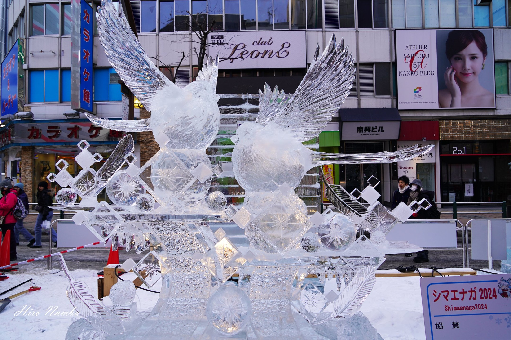 氷像オブジェの紹介。色んなキャラや北海道ならではの動物など。どれも力作揃いで、細かな質感が素晴らしく、氷点下の寒さも忘れ、いつまでも眺めていたくなりました。