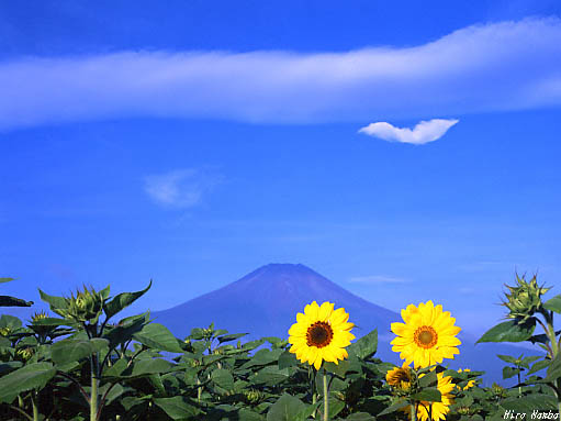 「 盛 夏 」 空を見上げると、真っ青な空にいい感じの雲が流れている。早速 カメラを空に向け、雲を取り込んでフレーミングした。ちょうちょみたいな雲がおもしろい。 撮影日時 1999年 7月24日 撮影場所 忍野村/内野(地図 No.12) フィルム フジクロームベルビア50 カメラ Pentax 67-II レンズ 90mm f4 データー f22 AE PLフィルター